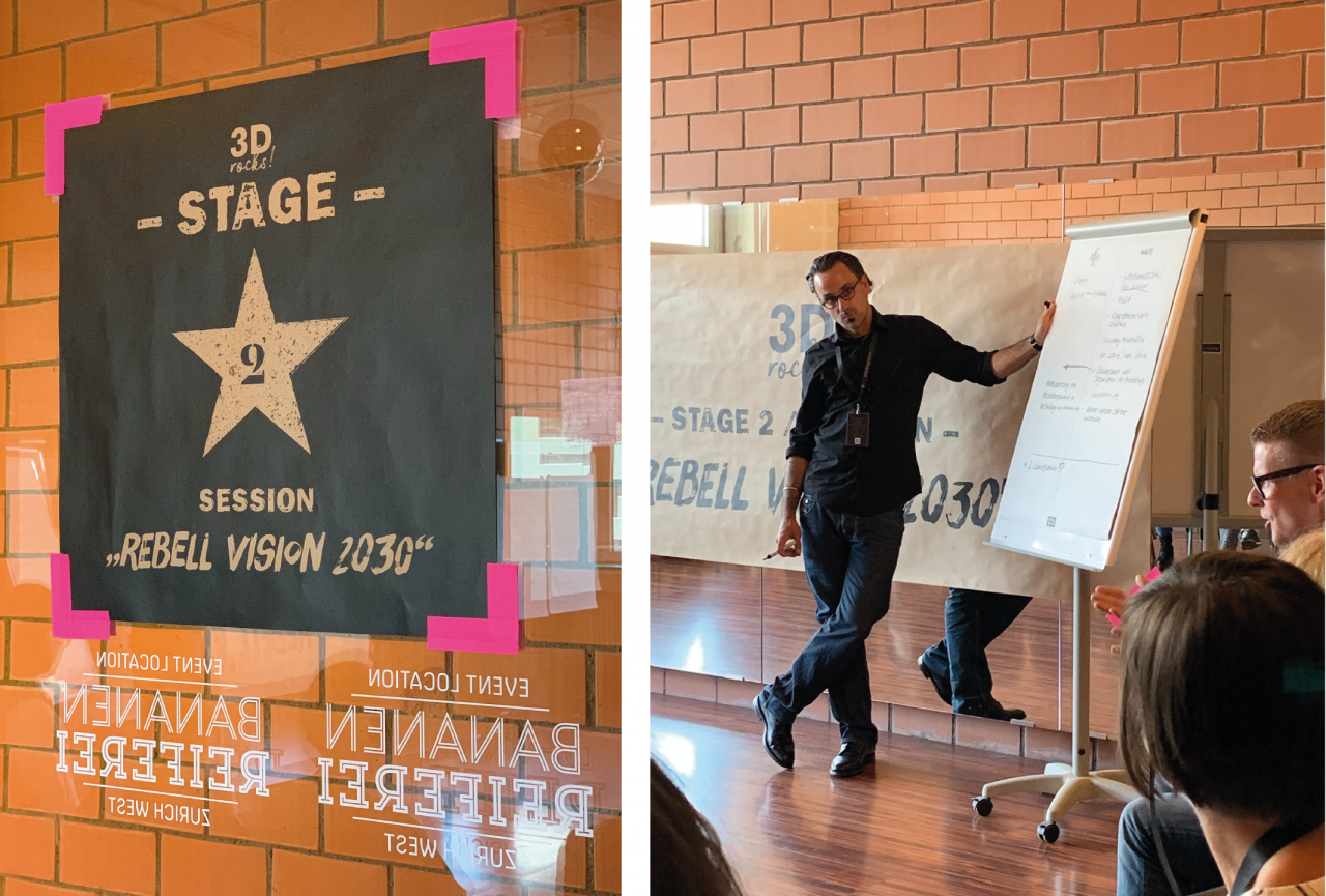 Am Nachmittag wurden vier Workshops angeboten, welche die Teilnehmenden in vier Gruppen unterteilt im Turnus besuchten. Nebst Inputsessions von den Workshopleitenden stand erneut die Diskussion und das Zusammentragen von Vorschlägen im Zentrum. Die Workshops widmeten sich verschiedenen Schwerpunkten: Roger Stämpfli, Executive Creative Director Aroma und Luca Viglianti, Art Director Globus leiteten den Austausch zum Thema «Inszenierungen im Omni-Channel Umfeld». Im Workshop «Rebell Vision 2030 – die wichtigsten Themen für eine Berufsreform» mit P3D-Präsident Luki Meier, Stefan Platter, Berufsinspektor Zürich sowie Jonas Schudel, Abteilungsleiter Schule für Gestaltung Zürich standen die Themen Top, Flop und RebellVision 2030 im Zentrum.