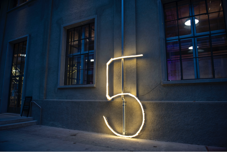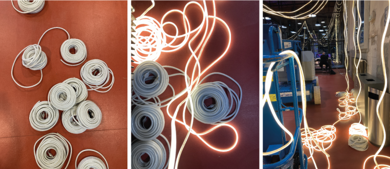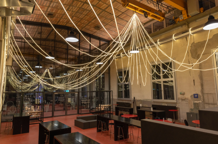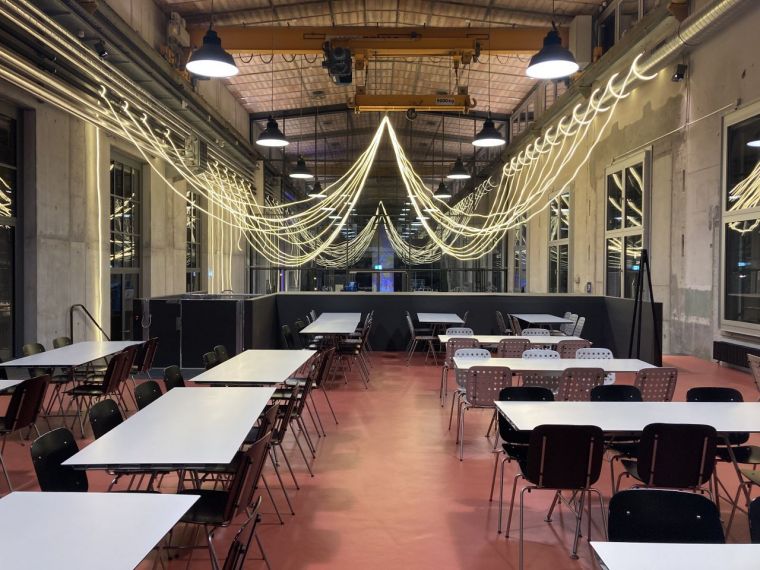 Als Inspiration für die Weihnachtsdeko der Schule diente nämlich die Baustellenbeleuchtung aus LED-Lichterschläuchen auf der Baustelle des Campus’ Bernapark. Die Idee, das Konzept und die Montage übernahm das Ausstellungsteam der Schule für Gestaltung, umgesetzt wurde die Weihnachtsinstallation im Restaurant BB in der Halle 4 im Campus Bernapark.
